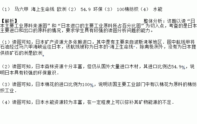 £¨1£© ÂíÁù¼× º£ÉÏÉúÃüÏß Å·ÖÞ£¨2£© 54.9 »·±££¨3£© 100ÃÞ·ÄÖ¯£¨4£© Ë®ÄÜ ¡¾½âÎö¡¿ÕûÌå·ÖÎö£º¸ÃÌâÒÔ¶Á¡°ÈÕ±¾Ö÷Òª¹¤ÒµÔÁÏÀ´Ô´Í¼¡±ºÍ¡°ÈÕ±¾½ø¿ÚµÄÖ÷Òª¹¤ÒµÔÁÏËùÕ¼°Ù·Ö±Èͼ¡±ÎªÇÐÈëµã£¬¿¼²éµÄÊÇÈÕ±¾Ö÷Òª½ø¿ÚºÍ³ö¿ÚµÄÔÁϵÄÇé¿ö£¬ÒªÇóѧÉú¾ßÓнÏÇ¿µÄ¶Áͼ·ÖÎöÎÊÌâµÄÄÜÁ¦¡£ £¨1£©¶Áͼ¿ÉÖª£¬ÈÕ±¾¿ó²ú×ÊÔ´´ó¶àÒÀÀµ½ø¿Ú£¬ÆäÖÐÊÇÓÐÖ÷ÒªÀ´×Ô²¨Ë¹ÍåµÈµØÇø£®Í¼Öк½Ïß¼×½«Ê¯Ó;¹ýÂíÁù¼×º£Ï¿ÔËÍùÈÕ±¾£¬¸Ãº½Ïß...