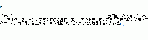 D 【解析】我国的矿产资源分布不均,北方多煤、铁、石油,南方多有色金属矿,如:云南个旧产锡矿、江西大余产钨矿、贵州铜仁产汞矿、广西平果产铝土矿等.南方地区的水能资源比北方地区丰富。所以选D。