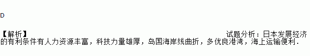D 【解析】试题分析:日本发展经济的有利条件有人力资源丰富,科技力量雄厚,岛国海岸线曲折,多优良港湾,海上运输便利.