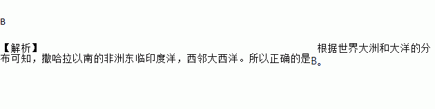 B 【解析】根据世界大洲和大洋的分布可知,撒哈拉以南的非洲东临印度洋,西邻大西洋。所以正确的是B。