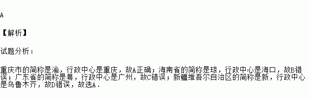 A 【解析】 试题分析: 重庆市的简称是渝,行政中心是重庆,故A正确;海南省的简称是琼,行政中心是海口,故B错误;广东省的简称是粤,行政中心是广州,故C错误;新疆维吾尔自治区的简称是新,行政中心是乌鲁木齐,故D错误,故选A.