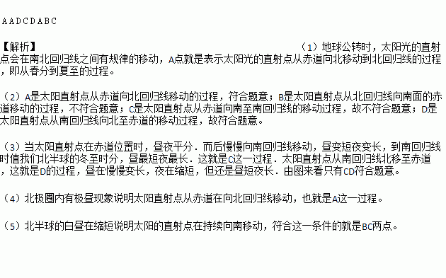 (2)太阳直射点向北移动的时段是__________、__________.(填字母)