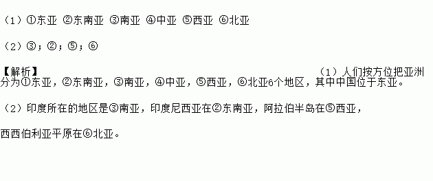 £¨1£©¢Ù¶«ÑÇ ¢Ú¶«ÄÏÑÇ ¢ÛÄÏÑÇ ¢ÜÖÐÑÇ ¢ÝÎ÷ÑÇ ¢Þ±±ÑÇ £¨2£©¢Û£»¢Ú£»¢Ý£»¢Þ ¡¾½âÎö¡¿£¨1£©ÈËÃǰ´·½Î»°ÑÑÇÖÞ·ÖΪ¢Ù¶«ÑÇ£¬¢Ú¶«ÄÏÑÇ£¬¢ÛÄÏÑÇ£¬¢ÜÖÐÑÇ£¬¢ÝÎ÷ÑÇ£¬¢Þ±±ÑÇ6¸öµØÇø£¬ÆäÖÐÖйúλÓÚ¶«ÑÇ¡£ £¨2£©Ó¡¶ÈËùÔڵĵØÇøÊÇ¢ÛÄÏÑÇ£¬Ó¡¶ÈÄáÎ÷ÑÇÔÚ¢Ú¶«ÄÏÑÇ£¬°¢À²®°ëµºÔÚ¢ÝÎ÷ÑÇ£¬ Î÷Î÷²®ÀûÑÇÆ½ÔÔÚ¢Þ±±ÑÇ¡£