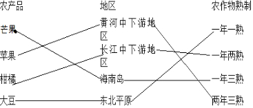 解答 解:芒果属于热带水果,主要分布在海南岛,作物熟制是一年一熟,苹果属于温带水果,主要分布在黄河中下游地区,作物熟制是两年三熟,柑橘属于亚热带水果,主要分布在长江中下游地区,作物熟制是一年两熟,大豆主要分布在东北平原,该地区属于中温带,作物熟制是一年一熟.
