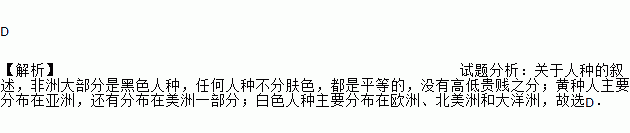 D 【解析】试题分析:关于人种的叙述,非洲大部分是黑色人种,任何人种不分肤色,都是平等的,没有高低贵贱之分;黄种人主要分布在亚洲,还有分布在美洲一部分;白色人种主要分布在欧洲、北美洲和大洋洲,故选D.