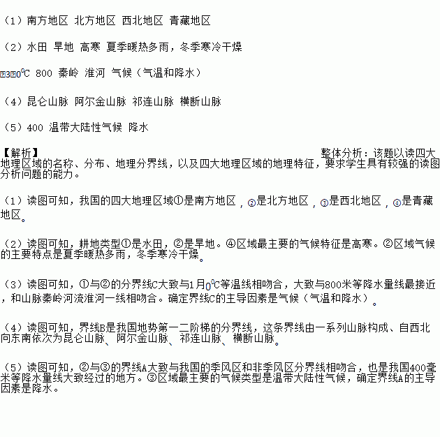 (1)南方地区 北方地区 西北地区 青藏地区 (2)水田 旱地 高寒 夏季暖热多雨,冬季寒冷干燥 (3)00C 800 秦岭 淮河 气候(气温和降水) (4)昆仑山脉 阿尔金山脉 祁连山脉 横断山脉 (5)400 温带大陆性气候 降水 【解析】整体分析:该题以读四大地理区域的名称、分布、地理分界线,以及四大地理区域的地理特征,要求学生具有较强的读图分析问题的能力。 ...