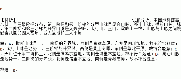 B 【解析】试题分析:中国地势西高东低,呈三级阶梯分布.第一阶梯和第二阶梯的分界山脉是昆仑山脉、祁连山脉、横断山脉一线,第二阶梯和第三阶梯的分界山脉是大兴安岭、太行山、巫山、雪峰山一线.山脉与山脉之间镶嵌着我国的四大高原、四大盆地和三大平原. 【解析】 A、横断山脉是一、二阶梯的分界线,西侧是青藏高原,东侧是四川盆地,故不符合题意;B、太行山脉是地势二、三阶梯的分界线,西侧是黄土高原...