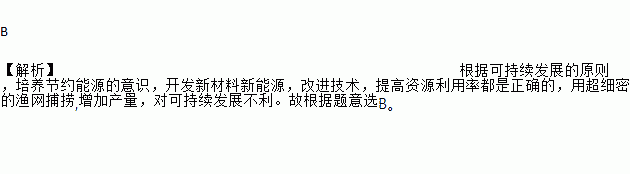 B ¡¾½âÎö¡¿¸ù¾Ý¿É³ÖÐø·¢Õ¹µÄÔÔò£¬ÅàÑø½ÚÔ¼ÄÜÔ´µÄÒâʶ£¬¿ª·¢Ð²ÄÁÏÐÂÄÜÔ´£¬¸Ä½ø¼¼Êõ£¬Ìá¸ß×ÊÔ´ÀûÓÃÂʶ¼ÊÇÕýÈ·µÄ£¬Óó¬Ï¸ÃܵÄÓæÍø²¶ÀÌ,Ôö¼Ó²úÁ¿£¬¶Ô¿É³ÖÐø·¢Õ¹²»Àû¡£¹Ê¸ù¾ÝÌâÒâÑ¡B¡£