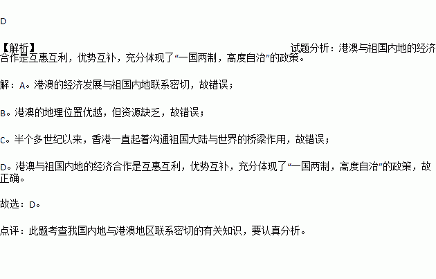 D. 港澳与祖国内地的经济合作是互惠互利,优势互补