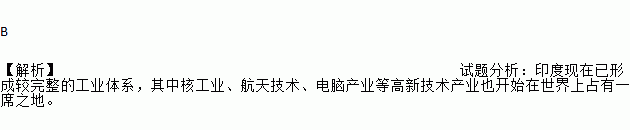 B 【解析】试题分析:印度现在已形成较完整的工业体系,其中核工业、航天技术、电脑产业等高新技术产业也开始在世界上占有一席之地。