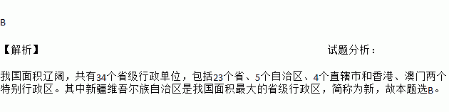B 【解析】试题分析: 我国面积辽阔,共有34个省级行政单位,包括23个省、5个自治区、4个直辖市和香港、澳门两个特别行政区。其中新疆维吾尔自治区是我国面积最大的省级行政区,简称为新,故本题选B。