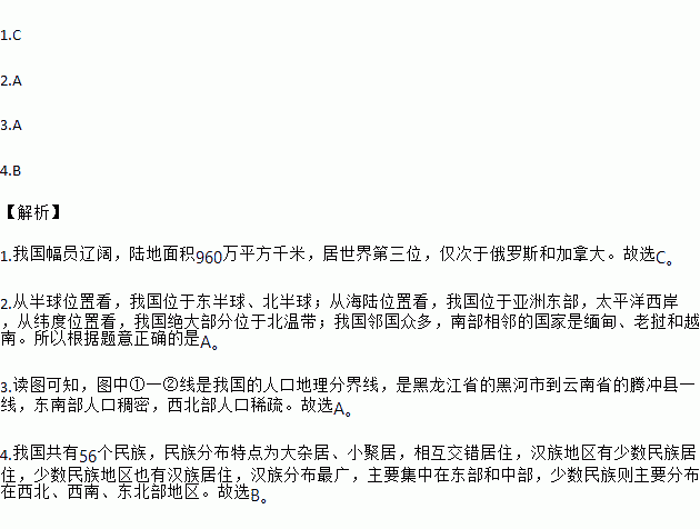 1.C 2.A 3.A 4.B ¡¾½âÎö¡¿ 1.ÎÒ¹ú·ùÔ±ÁÉÀ«£¬Â½µØÃæ»ý960Íòƽ·½Ç§Ã×£¬¾ÓÊÀ½çµÚÈý룬½ö´ÎÓÚ¶íÂÞ˹ºÍ¼ÓÄô󡣹ÊÑ¡C¡£ 2.´Ó°ëÇòλÖÿ´£¬ÎÒ¹úλÓÚ¶«°ëÇò¡¢±±°ëÇò£»´Óº£Â½Î»Öÿ´£¬ÎÒ¹úλÓÚÑÇÖÞ¶«²¿£¬Ì«Æ½ÑóÎ÷°¶£¬´Óγ¶ÈλÖÿ´£¬ÎÒ¹ú¾ø´ó²¿·ÖλÓÚ±±Î´ø£»ÎÒ¹úÁÚ¹úÖڶ࣬Äϲ¿ÏàÁڵĹú¼ÒÊÇÃåµé¡¢ÀÏÎκÍÔ½ÄÏ¡£ËùÒÔ¸ù¾ÝÌâÒâÕýÈ·µÄÊÇA¡£ 3.¶Áͼ¿ÉÖª£¬Í¼ÖТÙÒ»¢ÚÏßÊÇ...