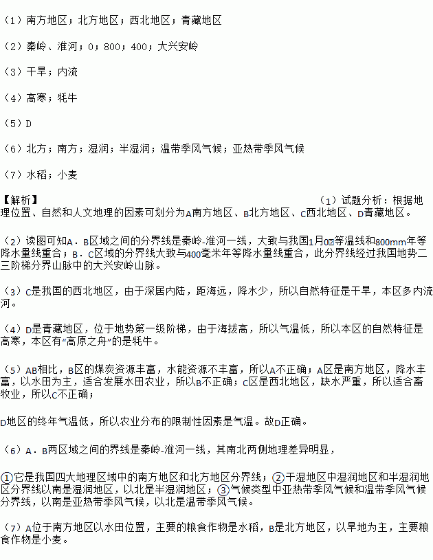 (1)南方地区;北方地区;西北地区;青藏地区 (2)秦岭、淮河;0;800;400;大兴安岭 (3)干旱;内流 (4)高寒;牦牛 (5)D (6)北方;南方;湿润;半湿润;温带季风气候;亚热带季风气候 (7)水稻;小麦 【解析】(1)试题分析:根据地理位置、自然和人文地理的因素可划分为A南方地区、B北方地区、C西北地区、D青藏地区。 (2)读图可知A...