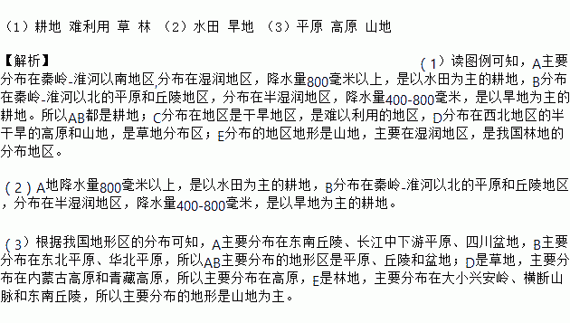 £¨1£©¸ûµØ ÄÑÀûÓà ²Ý ÁÖ £¨2£©Ë®Ìï ºµµØ £¨3£©Æ½Ô ¸ßÔ É½µØ ¡¾½âÎö¡¿£¨1£©¶ÁͼÀý¿ÉÖª£¬AÖ÷Òª·Ö²¼ÔÚÇØÁë-»´ºÓÒÔÄϵØÇø,·Ö²¼ÔÚʪÈóµØÇø£¬½µË®Á¿800ºÁÃ×ÒÔÉÏ£¬ÊÇÒÔË®ÌïΪÖ÷µÄ¸ûµØ£¬B·Ö²¼ÔÚÇØÁë-»´ºÓÒÔ±±µÄƽԺÍÇðÁêµØÇø£¬·Ö²¼ÔÚ°ëʪÈóµØÇø£¬½µË®Á¿400-800ºÁÃ×£¬ÊÇÒÔºµµØÎªÖ÷µÄ¸ûµØ¡£ËùÒÔAB¶¼ÊǸûµØ£»C·Ö²¼ÔÚµØÇøÊǸɺµµØÇø£¬ÊÇÄÑÒÔÀûÓõĵØÇø£¬D·Ö²¼ÔÚÎ÷±±µØÇøµÄ°ë¸ÉºµµÄ¸ßÔºÍɽµØ£¬ÊDzݵØ...