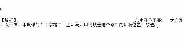 C 【解析】东南亚位于亚洲、大洋洲、太平洋、印度洋的“十字路口”上。马六甲海峡是这个路口的咽喉位置。故选C。