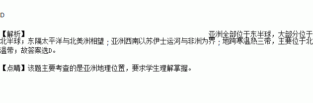C. 亚洲西北以苏伊士运河与非洲为界 D. 地跨寒温热三带,主要位于北温带