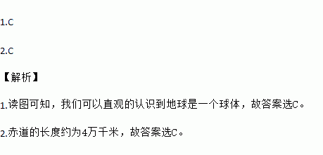 1.C 2.C 【解析】 1.读图可知,我们可以直观的认识到地球是一个球体,故答案选C。 2.赤道的长度约为4万千米,故答案选C。