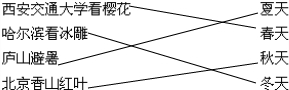 解:樱花是春季开放,因此应在春季到西安交通大学看樱花;哈尔滨位于我国北方,冬季寒冷干燥,有冰雕;夏季我国南北气温都较高,受地势影响,庐山成为避暑胜地;北京的秋季,可以观看香山红叶.