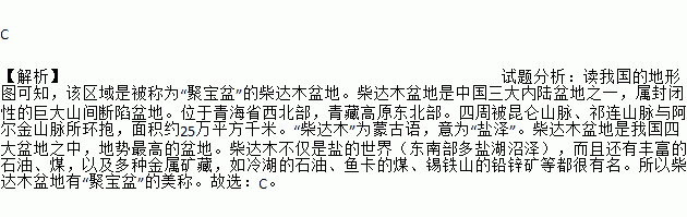 C 【解析】试题分析:读我国的地形图可知,该区域是被称为“聚宝盆”的柴达木盆地。柴达木盆地是中国三大内陆盆地之一,属封闭性的巨大山间断陷盆地。位于青海省西北部,青藏高原东北部。四周被昆仑山脉、祁连山脉与阿尔金山脉所环抱,面积约25万平方千米。“柴达木”为蒙古语,意为“盐泽”。柴达木盆地是我国四大盆地之中,地势最高的盆地。柴达木不仅是盐的世界(东南部多盐湖沼泽),而且还有丰富的石油、煤,以及多...