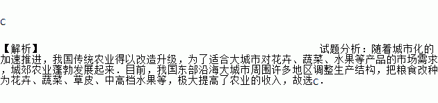 C 【解析】试题分析:随着城市化的加速推进,我国传统农业得以改造升级,为了适合大城市对花卉、蔬菜、水果等产品的市场需求,城郊农业蓬勃发展起来.目前,我国东部沿海大城市周围许多地区调整生产结构,把粮食改种为花卉、蔬菜、草皮、中高档水果等,极大提高了农业的收入,故选C.