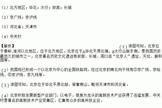 (1)北方地区;华北;太行;故宫;长城 (2)京广线;京沪线 (3)河北省;天津市 (4)中关村 【解析】(1)读图可知,北京位于秦岭-淮河以北地区,位于北方地区。北京位于A华北平原北端,B太行山脉东侧,是我国历史最悠久的城市之一,北京著名历史文化遗迹有故宫、长城、周口店“北京人”遗址、天坛、颐和园等。 (2)我国现已形成一个以北京为中心的全国铁路网,经过北京的南北向...