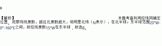 B 【解析】本题考查利用经纬网确定位置。观察纬线度数,越往北度数越大,说明是北纬(N表示),在北半球;东半球范围20°W-0°-160°E之间,故经线度数15°W在东半球,故选B。