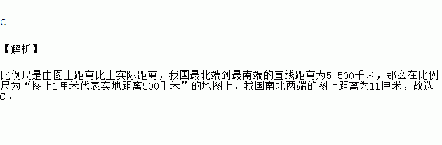 我国最北端到最南端的直线距离为5 500千米,那么在比例尺为“图上1厘米代表实地距离500千米”的地图上,我国南北两端的图上距离为( )