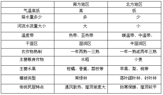 | | 秦岭-淮河以南 | 秦岭-淮河以北 |