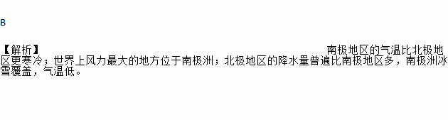 B 【解析】南极地区的气温比北极地区更寒冷;世界上风力最大的地方位于南极洲;北极地区的降水量普遍比南极地区多,南极洲冰雪覆盖,气温低。