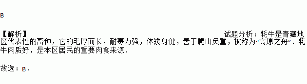 B 【解析】试题分析:牦牛是青藏地区代表性的畜种,它的毛厚而长,耐寒力强,体矮身健,善于爬山负重,被称为“高原之舟”.牦牛肉质好,是本区居民的重要肉食来源. 故选:B.