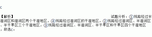 C ¡¾½âÎö¡¿ÊÔÌâ·ÖÎö£º¢ÙÏß·¾¹ý°ëʪÈóÇøºÍʪÈóÇøÁ½¸ö¸ÉʪµØÇø£¬¢ÜÏß·¾¹ýʪÈóÇøµÄ¸ÉʪµØÇø£¬¢ÚÏß·¾¹ýʪÈóÇø¡¢°ëʪÈóÇø¡¢°ë¸ÉºµÇøÈý¸ö¸ÉʪµØÇø£¬¢ÛÏß·¾¹ýʪÈóÇø¡¢°ëʪÈóÇø¡¢°ë¸ÉºµÇøºÍ¸ÉºµÇøËĸö¸ÉʪµØÇø£¬¹ÊÑ¡C¡£