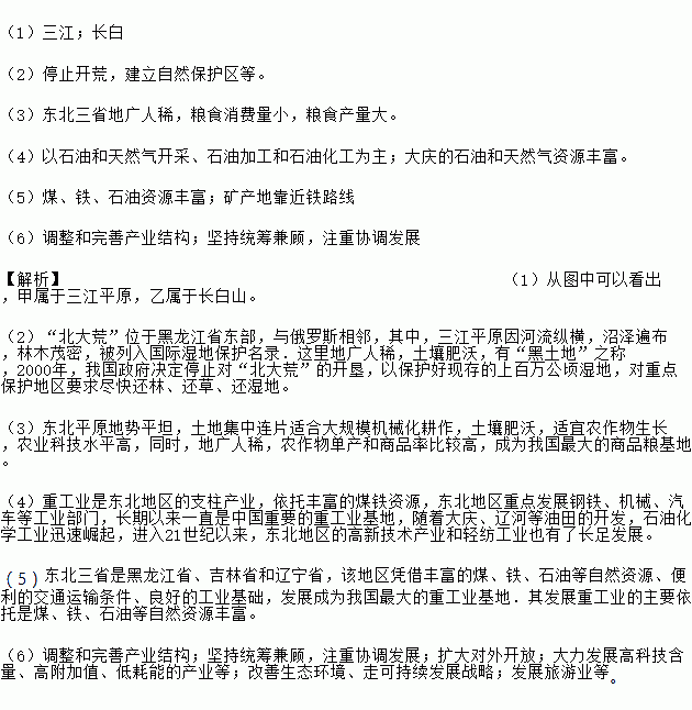 (1)三江;长白 (2)停止开荒,建立自然保护区等。 (3)东北三省地广人稀,粮食消费量小,粮食产量大。 (4)以石油和天然气开采、石油加工和石油化工为主;大庆的石油和天然气资源丰富。 (5)煤、铁、石油资源丰富;矿产地靠近铁路线 (6)调整和完善产业结构;坚持统筹兼顾,注重协调发展 【解析】(1)从图中可以看出,甲属于三江平原,乙属于长白山。 (2)“北...