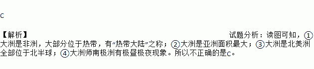 C 【解析】试题分析:读图可知,①大洲是非洲,大部分位于热带,有“热带大陆”之称;②大洲是亚洲面积最大;③大洲是北美洲全部位于北半球;④大洲师南极洲有极昼极夜现象。所以不正确的是C。