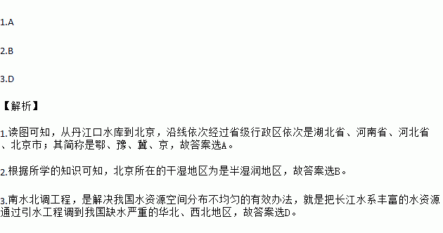 1.A 2.B 3.D 【解析】 1.读图可知,从丹江口水库到北京,沿线依次经过省级行政区依次是湖北省、河南省、河北省、北京市;其简称是鄂、豫、冀、京,故答案选A。 2.根据所学的知识可知,北京所在的干湿地区为是半湿润地区,故答案选B。 3.南水北调工程,是解决我国水资源空间分布不均匀的有效办法,就是把长江水系丰富的水资源通过引水工程调到我国缺水严重的华北、西北...