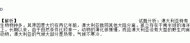 D ¡¾½âÎö¡¿ÊÔÌâ·ÖÎö£º°Ä´óÀûÑÇÌØÓÐÉúÎïÎïÖֶ࣬ÆäÔ­ÒòÊÇ´óÔ¼ÔÚÁ½ÒÚÄêǰ£¬°Ä´óÀûÑǾÍͬÆäËû´ó½·ÖÀ룬¹ÂÁ¢´æÔÚÓÚÄϰëÇòµÄº£ÑóÉÏ£¬³¤ÆÚÒÔÀ´£¬ÓÉÓÚ×ÔÈ»Ìõ¼þ±È½Ïµ¥Ò»£¬¶¯ÎïµÄÑÝ»¯ºÜ»ºÂý£¬¶øÇÒ°Ä´óÀûÑÇûÓдóÐ͵ÄÒ°ÉúÈâʳ¶¯Î°Ä´óÀûÑÇµÄÆøºò´ó²¿·ÖÊÇÈÈ´ø£¬Æøºò²»º®À䣮