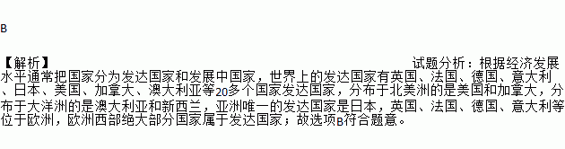 B ¡¾½âÎö¡¿ÊÔÌâ·ÖÎö£º¸ù¾Ý¾¼Ã·¢Õ¹Ë®Æ½Í¨³£°Ñ¹ú¼Ò·ÖΪ·¢´ï¹ú¼ÒºÍ·¢Õ¹Öйú¼Ò£¬ÊÀ½çÉϵķ¢´ï¹ú¼ÒÓÐÓ¢¹ú¡¢·¨¹ú¡¢µÂ¹ú¡¢Òâ´óÀû¡¢ÈÕ±¾¡¢ÃÀ¹ú¡¢¼ÓÄô󡢰ĴóÀûÑǵÈ20¶à¸ö¹ú¼Ò·¢´ï¹ú¼Ò£¬·Ö²¼ÓÚ±±ÃÀÖÞµÄÊÇÃÀ¹úºÍ¼ÓÄô󣬷ֲ¼ÓÚ´óÑóÖÞµÄÊǰĴóÀûÑǺÍÐÂÎ÷À¼£¬ÑÇÖÞΨһµÄ·¢´ï¹ú¼ÒÊÇÈÕ±¾£¬Ó¢¹ú¡¢·¨¹ú¡¢µÂ¹ú¡¢Òâ´óÀûµÈλÓÚÅ·ÖÞ£¬Å·ÖÞÎ÷²¿¾ø´ó²¿·Ö¹ú¼ÒÊôÓÚ·¢´ï¹ú¼Ò£»¹ÊÑ¡ÏîB·ûºÏÌâÒâ¡£