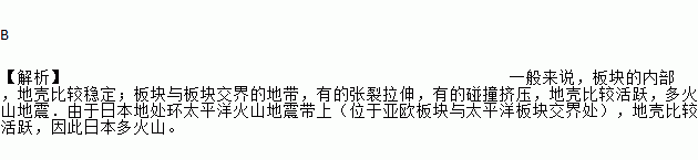 B 【解析】一般来说,板块的内部,地壳比较稳定;板块与板块交界的地带,有的张裂拉伸,有的碰撞挤压,地壳比较活跃,多火山地震.由于日本地处环太平洋火山地震带上(位于亚欧板块与太平洋板块交界处),地壳比较活跃,因此日本多火山。