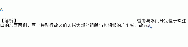 A 【解析】香港与澳门分别位于珠江口的东西两侧,两个特别行政区的居民大部分祖籍与其相邻的广东省,故选A。