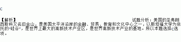 C 【解析】试题分析:美国的圣弗朗西斯科又名旧金山,是美国太平洋沿岸的金融、贸易、教育和文化中心之一,以斯坦福大学为依托的“硅谷”,是世界上最大的高新技术产业区,是世界高新技术产业的基地。所以本题选择C选项。