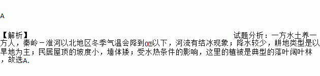 A 【解析】试题分析:一方水土养一方人,秦岭-淮河以北地区冬季气温会降到0℃以下,河流有结冰现象;降水较少,耕地类型是以旱地为主;民居屋顶的坡度小,墙体矮;受水热条件的影响,这里的植被是典型的落叶阔叶林,故选A.