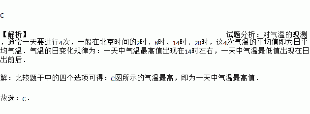 C ¡¾½âÎö¡¿ÊÔÌâ·ÖÎö£º¶ÔÆøÎµĹ۲⣬ͨ³£Ò»ÌìÒª½øÐÐ4´Î£¬Ò»°ãÔÚ±±¾©Ê±¼äµÄ2ʱ¡¢8ʱ¡¢14ʱ¡¢20ʱ£¬Õâ4´ÎÆøÎÂµÄÆ½¾ùÖµ¼´ÎªÈÕÆ½¾ùÆøÎ£®ÆøÎµÄÈձ仯¹æÂÉΪ£ºÒ»ÌìÖÐÆøÎÂ×î¸ßÖµ³öÏÖÔÚ14ʱ×óÓÒ£¬Ò»ÌìÖÐÆøÎÂ×îµÍÖµ³öÏÖÔÚÈÕ³öǰºó£® ¡¾½âÎö¡¿ ±È½ÏÌâ¸ÉÖеÄËĸöÑ¡Ïî¿ÉµÃ£ºCͼËùʾµÄÆøÎÂ×î¸ß£¬¼´ÎªÒ»ÌìÖÐÆøÎÂ×î¸ßÖµ£® ¹ÊÑ¡£ºC£®