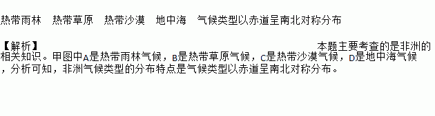 热带雨林热带草原热带沙漠地中海气候类型以赤道呈南北对称分布 【解析】本题主要考查的是非洲的相关知识。甲图中A是热带雨林气候,B是热带草原气候,C是热带沙漠气候,D是地中海气候,分析可知,非洲气候类型的分布特点是气候类型以赤道呈南北对称分布。