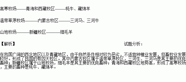 将四大牧区与牧场类型、著名畜种连线:____________。