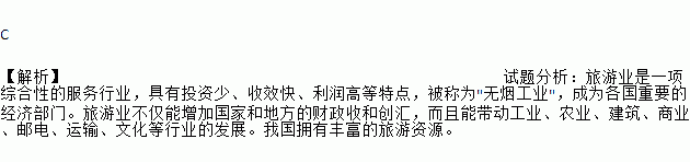 C ¡¾½âÎö¡¿ÊÔÌâ·ÖÎö£ºÂÃÓÎÒµÊÇÒ»Ïî×ÛºÏÐԵķþÎñÐÐÒµ£¬¾ßÓÐͶ×ÊÉÙ¡¢ÊÕЧ¿ì¡¢ÀûÈó¸ßµÈÌØµã£¬±»³ÆÎª"ÎÞÑ̹¤Òµ"£¬³ÉΪ¸÷¹úÖØÒªµÄ¾¼Ã²¿ÃÅ¡£ÂÃÓÎÒµ²»½öÄÜÔö¼Ó¹ú¼ÒºÍµØ·½µÄ²ÆÕþÊպʹ´»ã£¬¶øÇÒÄÜ´ø¶¯¹¤Òµ¡¢Å©Òµ¡¢½¨Öþ¡¢ÉÌÒµ¡¢Óʵ硢ÔËÊä¡¢ÎÄ»¯µÈÐÐÒµµÄ·¢Õ¹¡£ÎÒ¹úÓµÓзḻµÄÂÃÓÎ×ÊÔ´¡£