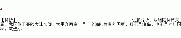 A 【解析】试题分析:从海陆位置来看,我国位于亚欧大陆东部、太平洋西岸,是一个海陆兼备的国家,既不是海岛,也不是内陆国家,故选A.