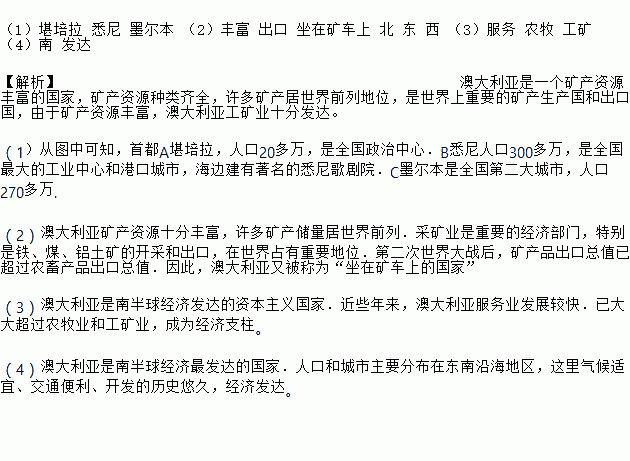 (1)堪培拉 悉尼 墨尔本 (2)丰富 出口 坐在矿车上 北 东 西 (3)服务 农牧 工矿 (4)南 发达 【解析】澳大利亚是一个矿产资源丰富的国家,矿产资源种类齐全,许多矿产居世界前列地位,是世界上重要的矿产生产国和出口国,由于矿产资源丰富,澳大利亚工矿业十分发达。 (1)从图中可知,首都A堪培拉,人口20多万,是全国政治中心.B悉尼人口300多万,是全国最大的工业中心和港口城市,...