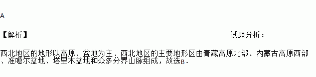 A 【解析】试题分析: 西北地区的地形以高原、盆地为主.西北地区的主要地形区由青藏高原北部、内蒙古高原西部、准噶尔盆地、塔里木盆地和众多分界山脉组成,故选B.