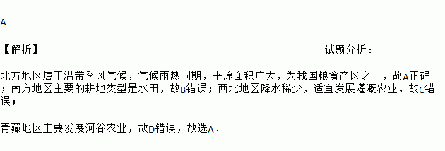 A 【解析】试题分析: 北方地区属于温带季风气候,气候雨热同期,平原面积广大,为我国粮食产区之一,故A正确;南方地区主要的耕地类型是水田,故B错误;西北地区降水稀少,适宜发展灌溉农业,故C错误; 青藏地区主要发展河谷农业,故D错误,故选A.