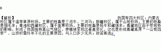 B ¡¾½âÎö¡¿ÎÒ¹úÓÐËÄ´óÄÁÇø£ºÄÚÃɹÅÄÁÇøÊôÓÚδø²ÝÔÄÁ³¡£¬Ö÷ÒªµÄÉüÐóÊÇÈýºÓÅ£¡¢ÈýºÓÂí£»Ð½®ÄÁÇø£¬ÊôÓÚɽµØÄÁ³¡£¬Ö÷ÒªµÄÉüÐóÊÇϸëÑò£»ÇຣºÍÎ÷²ØÄÁÇø£¬ÊôÓڸߺ®ÄÁ³¡£¬Ö÷ÒªµÄÉüÐóÊÇêóÅ£ºÍ²ØÃàÑò£»Çà²ØµØÇøÓÉÓÚÊܵØÊƵÄÓ°Ï죬ÐγÉÁËÎÒ¹ú¶ÀÌØ¸ßÉ½ÆøºòÇø£¬Ê¹Ö²±»³ÊÏÖ³ö´¹Ö±±ä»¯£¬ÕâÒ²ÊÇÐγÉÇà²Ø¸ßÔ¡°Ò»É½ÓÐËᄀ±¡¢É½¶¥»ýÑ©ÖÕÄê²»»¯µÄÖ÷ÒªÔÒò£¬ÓëÈ˿ڶàÉÙÎ޹أ»¹Ê´ð°¸Ñ¡B¡£