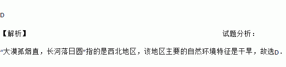 D 【解析】试题分析: “大漠孤烟直,长河落日圆”指的是西北地区,该地区主要的自然环境特征是干旱,故选D.